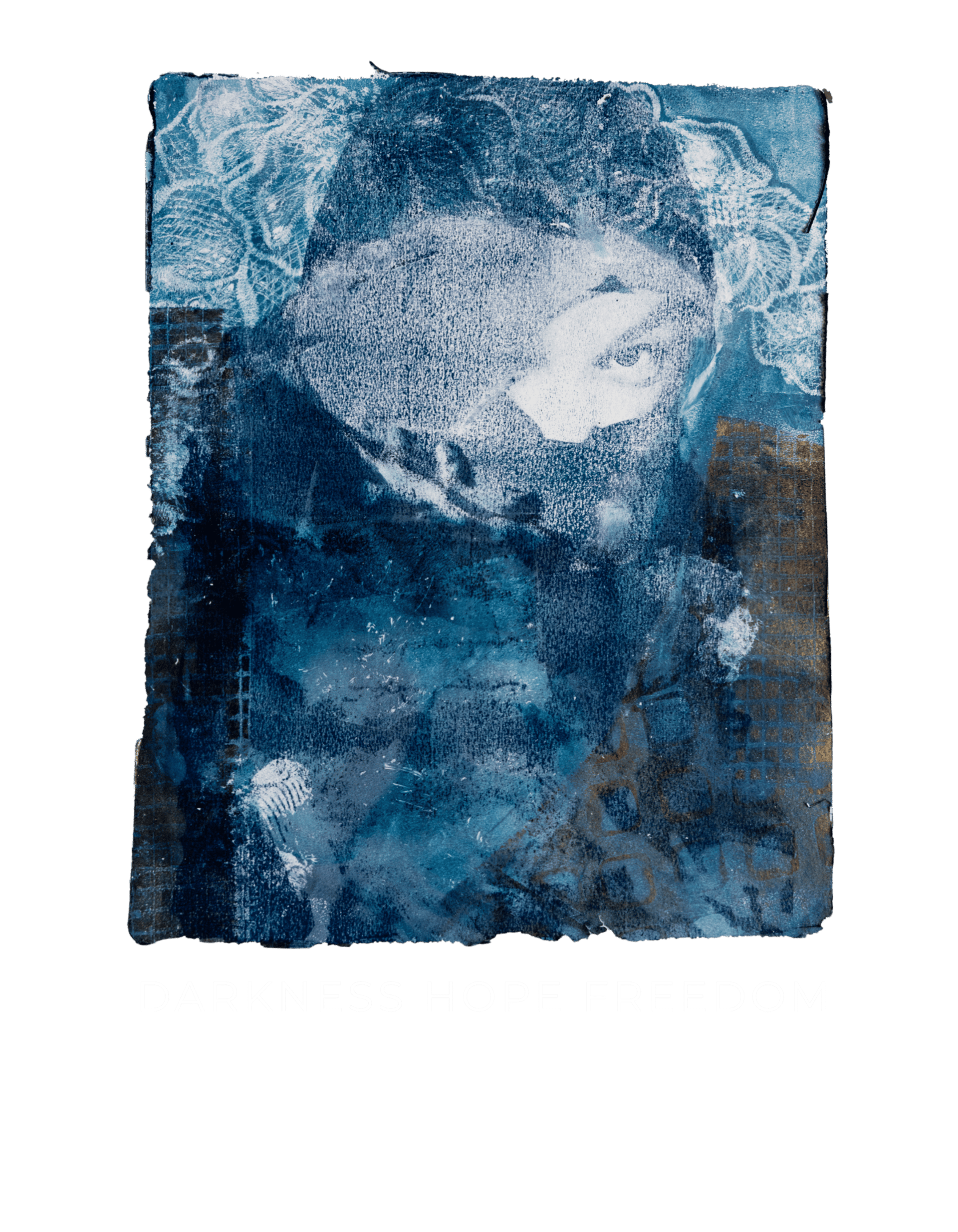 I learned Gel Printing about two years ago, and quickly fell in love with the process...especially learning to transfer my photos onto the printing plate and using paint and stencils to create new designs. That is how the design you see on the t-shirt came about. I transferred the previous photo onto the gel plate and then added other elements to it to tell a broader story of the suffering the Uyghurs are experiencing.